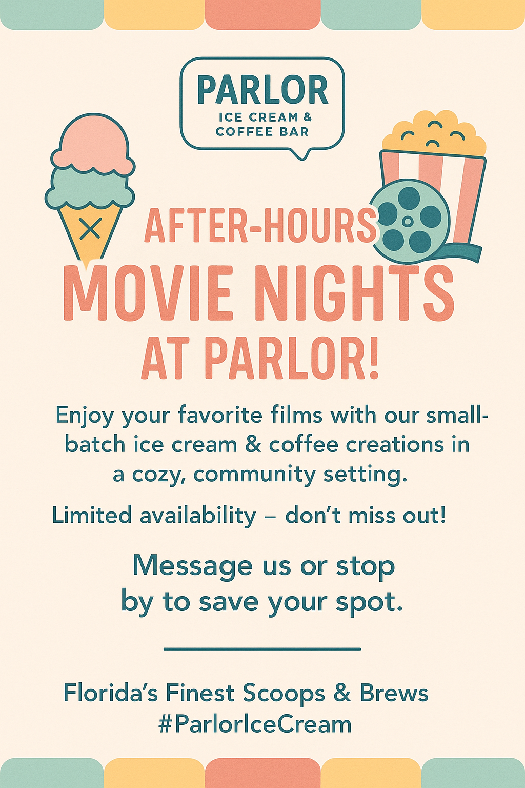 Looking for something fun to do in Stuart? We’re rolling out Movie Nights after hours at Parlor Ice Cream & Coffee Bar!